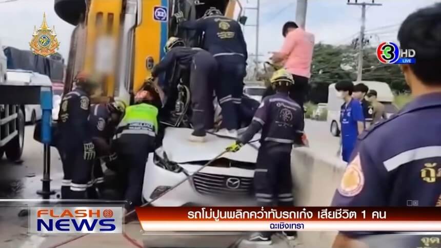 - รถโม่ปูนพลิกคว่ำ ทับรถเก๋งเสียชีวิต 1 คน