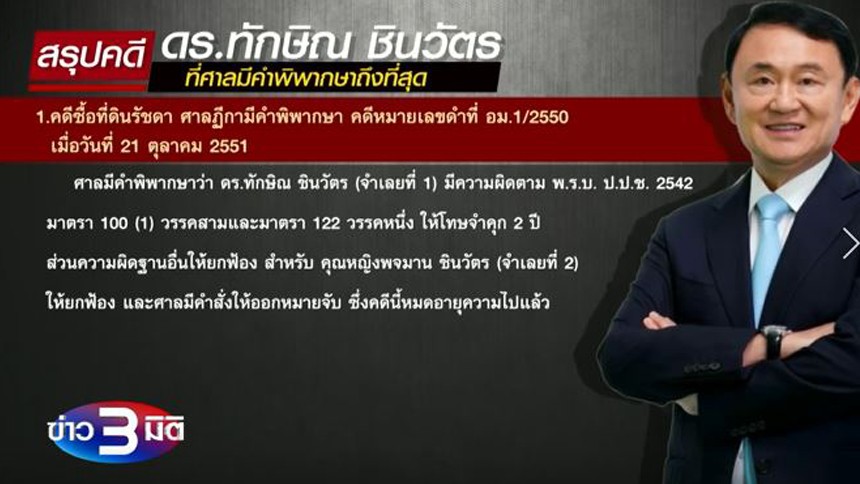 1.คดีซื้อที่ดินรัชดา เมื่อวันที่ 21 ตุลาคม 2551 ว่า ดร.ทักษิณ ชินวัตร มีความผิดตาม พ.ร.บ. ป.ป.ช. 2542 ให้โทษจำคุก 2 ปี ซึ่งคดีนี้หมดอายุความไปแล้ว