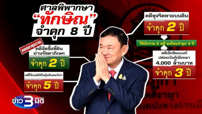 โดยบอกว่าคดีศาลฎีกาออกหมายจำคุกคดีถึงที่สุดไปเมื่อ วันที่ 22 สิงหาคม ที่ผ่านมา มี 3 คดี คือ คดีหมายเลขแดงที่ อม. 4/2551 คดีเกี่ยวกับธนาคารเพื่อการนำเข้าและส่งออก หรือเอ็กซิมแบงค์ ลงโทษจำคุก 3 ปี คดีหมายเลขแดงที่ อม. 10/2552 หรือคดีหวยบนดิน ลงโทษจำคุก 2 ปี และคดีหมายเลขแดงที่ อม. 5/2551 หรือคดีหุ้นชินคอร์ป ลงโทษจำคุก 5 ปี