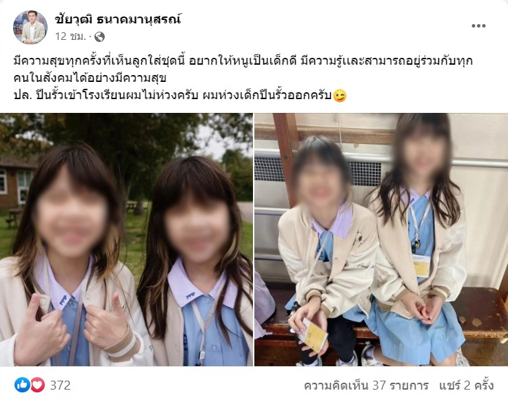 “มีความสุขทุกครั้งที่เห็นลูกใส่ชุดนี้ อยากให้หนูเป็นเด็กดี มีความรู้เเละสามารถอยู่ร่วมกับทุกคนในสังคมได้อย่างมีความสุข ปล. ปีนรั้วเข้าโรงเรียนผมไม่ห่วงครับ ผมห่วงเด็กปีนรั้วออกครับ”