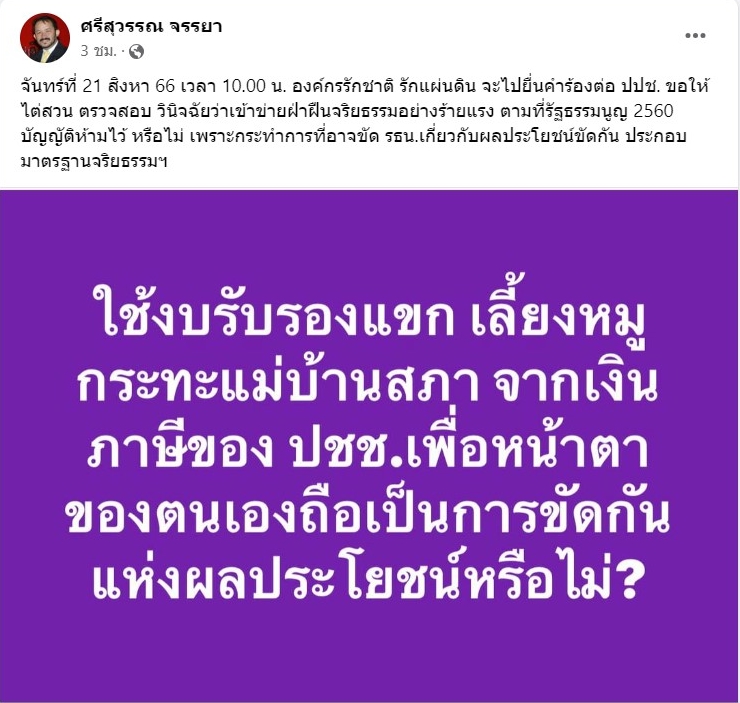 ล่าสุด นายศรีสุวรรณ จรรยา ได้โพสต์ตั้งข้อสังสัยถึงเรื่องดังกล่าวว่า “ใช้งบรับรองแขก เลี้ยงหมูกระทะแม่บ้านสภา จากเงินภาษีของ ปชช.เพื่อหน้าตาของตนเอง ถือเป็นการขัดกันแห่งผลประโยชน์หรือไม่?”
