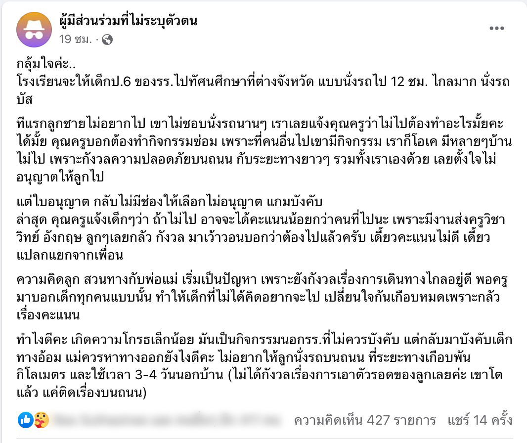 ผู้ปกครองรายหนึ่ง โพสต์บนกลุ่มเฟซบุ๊ก ห้องนั่งเล่นพ่อแม่ หลังกังวลโรงเรียนประถมศึกษาของลูกชายจัดกิจกรรมทัศนศึกษาที่ต่างจังหวัด คุณแม่จึงห่วงเรื่องความปลอดภัยบนถนน แต่โรงเรียนบังคับนักเรียนทางอ้อมให้ร่วมกิจกรรมโดยให้เหตุผลเรื่องคะแนน อาจมีผลต่อเกรด ซึ่งคุณแม่เขียนข้อความระบุว่า