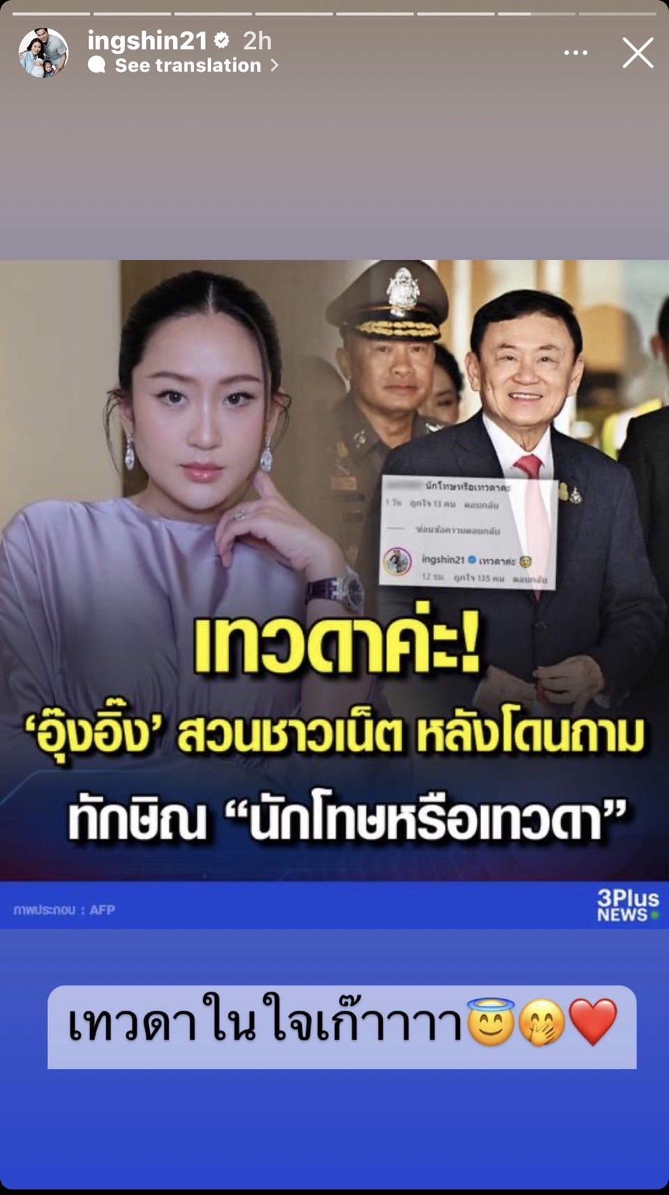 จนมีชาวเน็ตเข้าไปคอมเมนต์ในอินสตาแกรมส่วนตัวของ ‘อุ๊งอิ๊ง แพทองธาร’ ตั้งคำถามว่า ‘ทักษิณ’ เป็นนักโทษหรือเทวดา เจ้าตัวตอบกลับสั้นๆ “เทวดาค่ะ” ทำเอาโลกออนไลน์ เกิดกระแสวิพากษ์วิจารณ์อย่างร้อนแรง