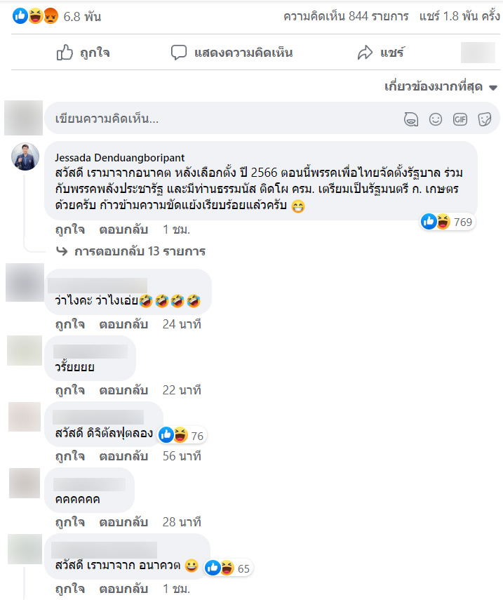 วันนี้ (29 ส.ค. 2566) โพสต์ดังกล่าวกลับมามีผู้เข้ามาแชร์และแสดงความคิดเห็นเป็นจำนวนมาก หนึ่งในนั้นมี รศ.ดร.เจษฎา เด่นดวงบริพันธ์ อาจารย์ประจำภาควิชาชีววิทยา คณะวิทยาศาสตร์ จุฬาฯ และเจ้าของเพจดัง ระบุข้อความว่า “สวัสดี เรามาจากอนาคต หลังเลือกตั้ง ปี 2566 ตอนนี้พรรคเพื่อไทยจัดตั้งรัฐบาล ร่วมกับพรรคพลังประชารัฐ และมีท่านธรรมนัส ติดโผ ครม. เตรียมเป็นรัฐมนตรี ก. เกษตร ด้วยครับ ก้าวข้ามความขัดแย้งเรียบร้อยแล้วครับ”