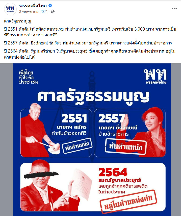 ล่าสุด ชาวเน็ตกลับมาขุดโพสต์เฟซบุ๊กของเพจพรรคเพื่อไทย ที่โพสต์เมื่อวันที่ 8 พฤษภาคม 2564 เป็นภาพอินโฟกราฟิก พร้อมข้อความระบุว่า “ศาลรัฐธรรมนูญ ปี 2551 ตัดสินให้ สมัคร สุนทรเวช พ้นตำแหน่งนายกรัฐมนตรี เพราะรับเงิน 3,000 บาท จากการเป็นพิธีกรรายการทำอาหารออกทีวี