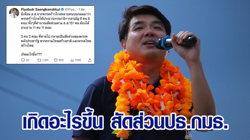 วันนี้ (5 ต.ค.) นายปิยบุตร แสงกนกกุล เลขาธิการคณะก้าวหน้า โพสต์ข้อความบน x ภายหลังมีการแบ่งคณะกรรมาธิการสามัญ สภาผู้แทนราษฎร ว่า มีเพื่อน ส.ส.จากพรรคก้าวไกลหลายคนบอกผมมาว่า พรรคก้าวไกลได้ประธานกรรมาธิการสามัญ 8 คน 8 คณะ ทั้งๆที่คำนวณสัดส่วนตาม ส.ส.151 คน ต้องได้ประธาน 11 คน 11 คณะ 3 คน 3 คณะ ที่หายไป กลายเป็นสัดส่วนของพรรคพลังประชารัฐ พรรครวมไทยสร้างชาติ และพรรคไทยสร้างไทย เกิดอะไรขึ้น