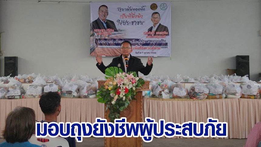วันนี้ (7 ต.ค.) นายสมศักดิ์ เทพสุทิน รองนายกรัฐมนตรี พร้อมด้วย นางอนงค์วรรณ เทพสุทิน อดีตรัฐมนตรีว่าการกระทรวงทรัพยากรธรรมชาติและสิ่งแวดล้อม น.ส.ณัฐธิดา เทพสุทิน บุตรสาว นายมนู พุกประเสริฐ นายก อบจ.สุโขทัย นางพรรณสิริ กุลนาถศิริ สส.สุโขทัย น.ส.ประภาพร ทองปากน้ำ สส.สุโขทัย นายเขตพงศ์ กุลนาถศิริ รองนายก อบจ.สุโขทัย ได้ลงพื้นที่จังหวัดสุโขทัย โดยมีนายสุชาติ ทีคะสุข ผู้ว่าราชการจังหวัดสุโขทัย เข้าร่วม เพื่อมอบถุงยังชีพให้แก่ผู้ประสบภัย จำนวน 2,000 ชุด ใน 2 พื้นที่ คือ วัดบ้านไร่ อำเภอศรีสำโรง และ วัดปากคลอง อำเภอเมือง นอกจากนี้ ยังได้มอบเงินเยียวยาให้แก่ครอบครัวผู้เสียชีวิตจากเหตุอุทกภัยในจังหวัดสุโขทัย จำนวน 5 ราย โดยมอบเป็นค่าจัดการศพ รายละ 50,000 บาท และเงินทุนเลี้ยงชีพแก่ครอบครัวผู้เสียชีวิต รายละ 30,000 บาท