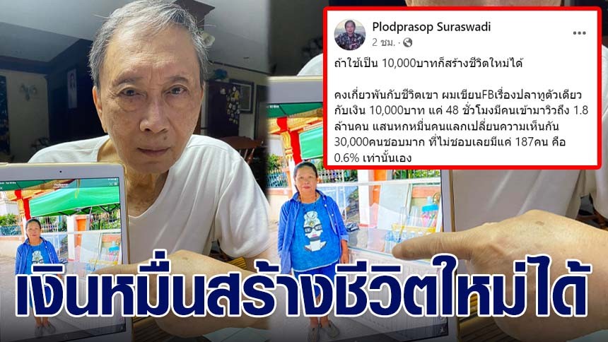 "คงเกี่ยวพันกับชีวิตเขา ผมเขียน FB เรื่องปลาทูตัวเดียวกับเงิน 10,000 บาท แค่ 48 ชั่วโมงมีคนเข้ามาวิวถึง 1.8 ล้านคน แสนหกหมื่นคนแลกเปลี่ยนความเห็นกัน 30,000 คนชอบมาก ที่ไม่ชอบเลยมีแค่ 187คน คือ 0.6% เท่านั้นเอง