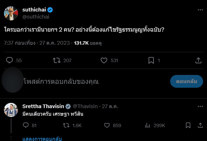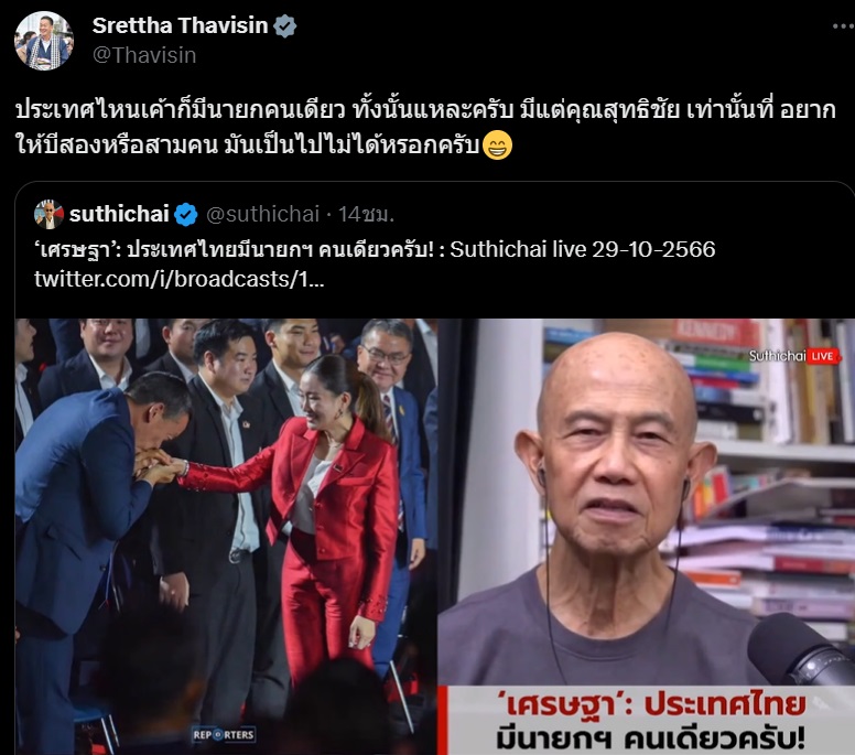 ทำให้นายเศรษฐา โพสต์ข้อความโต้กลับอีกครั้งว่า “ประเทศไหนเค้าก็มีนายกคนเดียว ทั้งนั้นแหละครับ มีแต่คุณสุทธิชัย เท่านั้นที่ อยากให้มีสองหรือสามคน มันเป็นไปไม่ได้หรอกครับ”