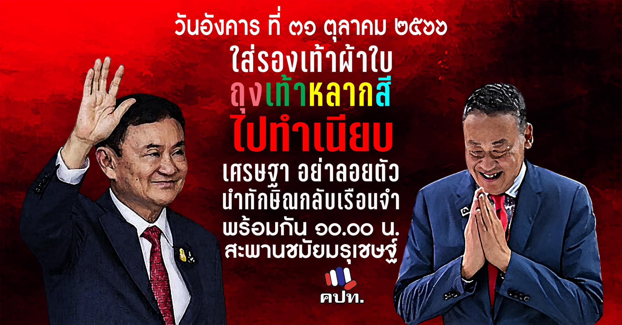 เพจเฟซบุ๊ก คปท. (เครือข่ายนักศึกษาประชาชนปฏิรูปประเทศไท) โพสต์นัดรวมตัวมุ่งหน้าทำเนียบรัฐบาล ระบุ "พรุ่งนี้ วันอังคารที่ 31 ตุลาคม 2566 สิบโมงเช้า ที่สะพานชมัยมรุเซษฐ์ "รองเท้าผ้าใบกับถุงเท้าหลากสี ไปทำเนียบ" เศรษฐาอย่าลอยตัว นำทักษิณกลับเรือนจำ