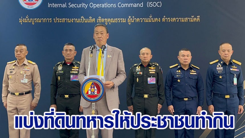 นายกรัฐมนตรี ระบุว่า อีกเรื่องที่เป็นเรื่องใหญ่ และมองว่ากองทัพมีความปรารถนาดี ซึ่งมีการพูดคุยตั้งแต่วันแรๆที่ตนเข้าสู่ตำแหน่งนายกรัฐมนตรี คือการแก้ไขปัญหาความยากจน ปัญหาที่ดินทำ โดยนำที่ดินของหน่วยทหารที่เกินความจำเป็นมาใช้ให้เป็นประโยชน์กับประชาชน โดยเฉพาะที่ดินทำการเกษตร ใช้เป็นแหล่งเรียนรู้ เพื่อสร้างรายได้ สร้างโอกาสและความเข้มแข็งด้านสังคมของประเทศ พร้อมขอชื่นชมกองทัพได้นำนโยบายการนำที่ดินที่ดูแลภายใต้กองทัพมาดำเนินการผ่านโครงการหนองวัวซอโมเดล มีเนื้อที่ 9,276 ไร่ มีกำหนดส่งมอบให้กับประชาชนในวันที่ 25 ธันวาคม 66 นี้ ถือเป็นของขวัญปีใหม่ให้กับประชาชนจากกองทัพไทย ซึ่งเรื่องนี้เป็นส่วนที่ดีที่กองทัพไทยจะได้ร่วมมือในการพัฒนาประเทศและขยายไปในพื้นที่ต่างๆ