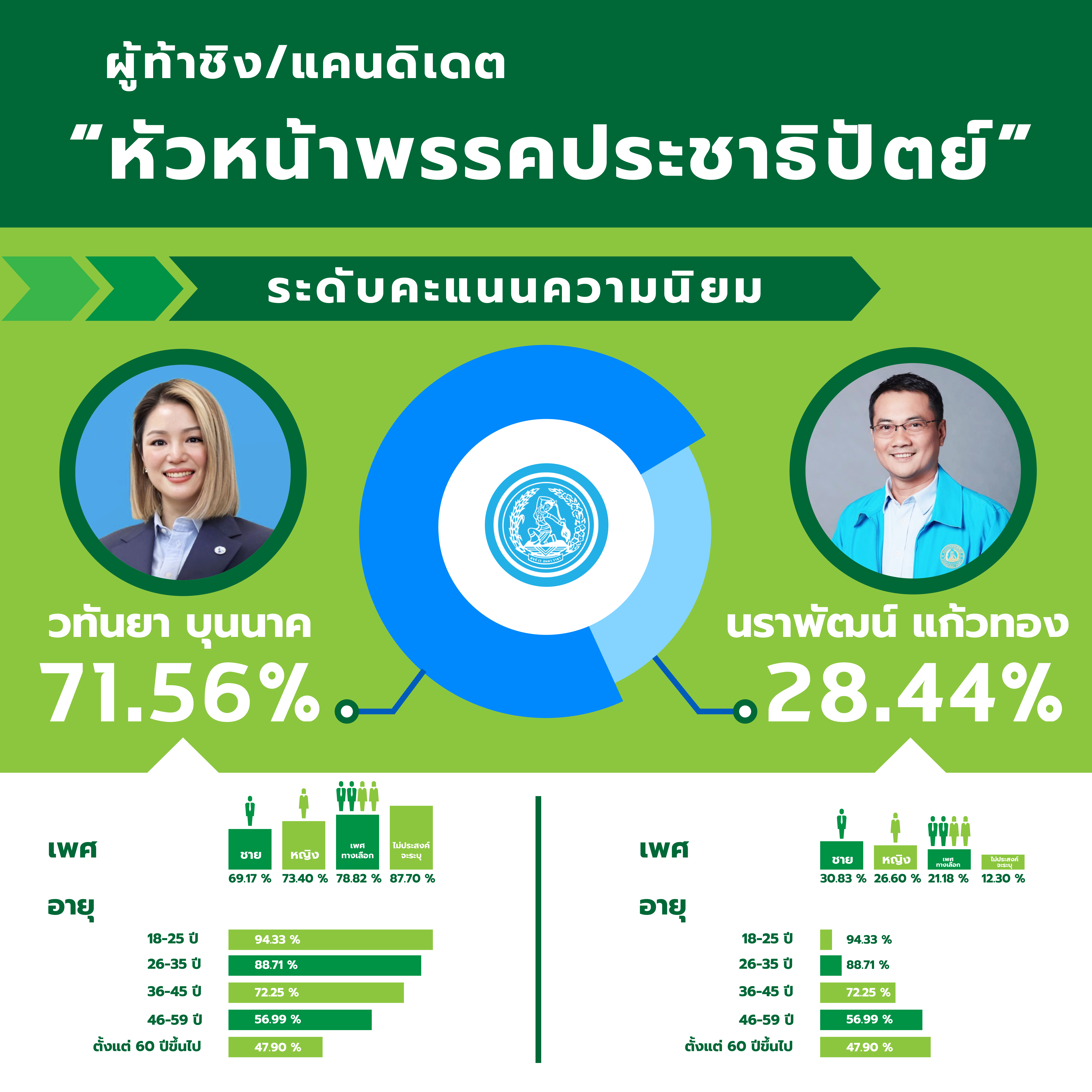 1.ผู้ท้าชิง/แคนดิเดต “หัวหน้าพรรคประชาธิปัตย์” พบว่า ประชาชน ร้อยละ 71.56 ให้ความเห็นว่าผู้ที่เหมาะสมในการดำรงตำแหน่งหัวหน้าพรรค คือ น.ส.วทันยา บุนนาค (มาดามเดียร์) และ ร้อยละ 28.44 คือ นายนราพัฒน์ แก้วทอง