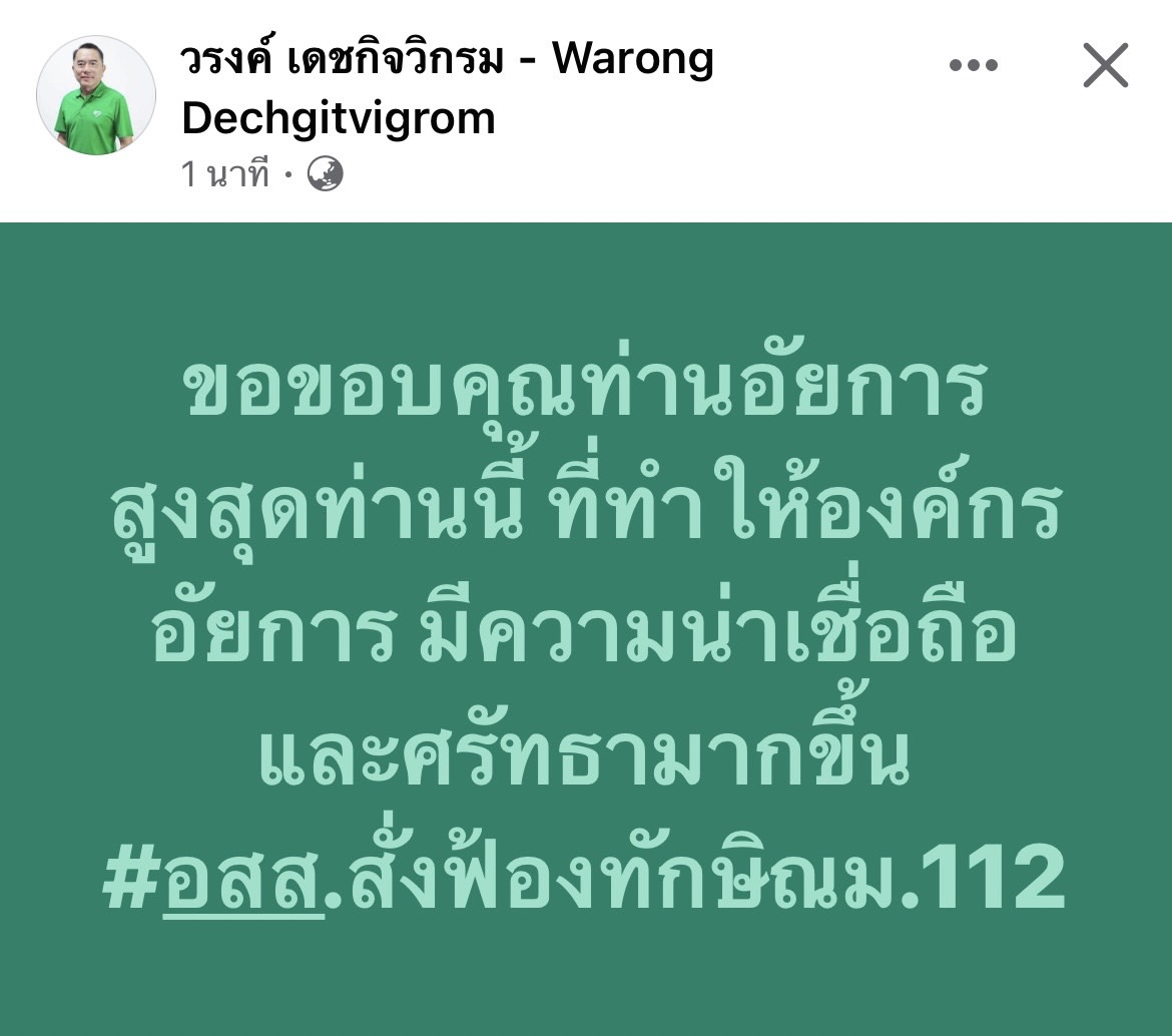 นพ.วรงค์ เดชกิจวิกรม ประธานพรรคไทยภักดี โพสต์เฟซบุ๊กสั้นๆ ว่า ขอขอบคุณท่านอัยการสูงสุดท่านนี้ ที่ทำให้องค์กรอัยการ มีความน่าเชื่อถือและศรัทธามากขึ้น พร้อมติดแฮชแท็ก #อสส.สั่งฟ้องทักษิณม.112