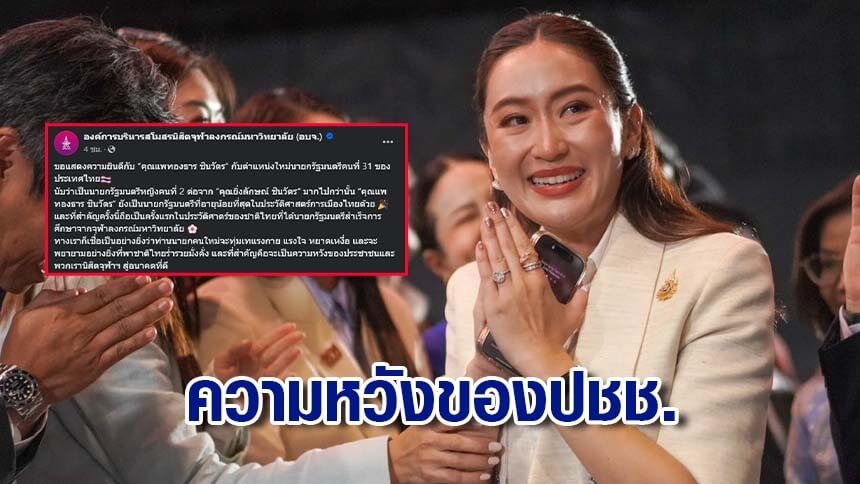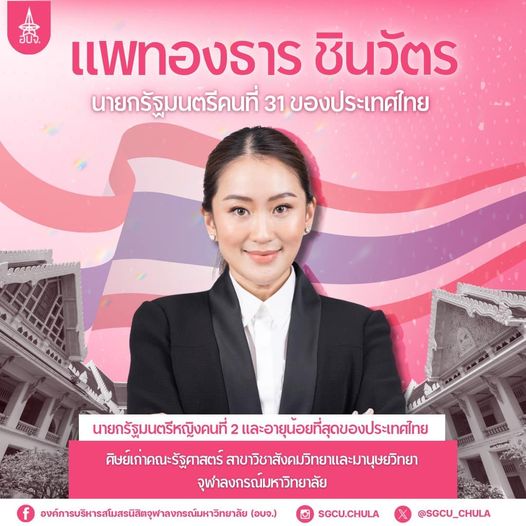 “ขอแสดงความยินดีกับ ‘คุณแพทองธาร ชินวัตร’ กับตําแหน่งใหม่นายกรัฐมนตรีคนที่ 31 ของประเทศไทยนับว่าเป็นนายกรัฐมนตรีหญิงคนที่ 2 ต่อจาก ‘คุณยิ่งลักษณ์ ชินวัตร’ มากไปกว่านั้น ‘คุณแพทองธาร ชินวัตร’ ยังเป็นนายกรัฐมนตรีที่อายุน้อยที่สุดในประวัติศาสตร์การเมืองไทยด้วย