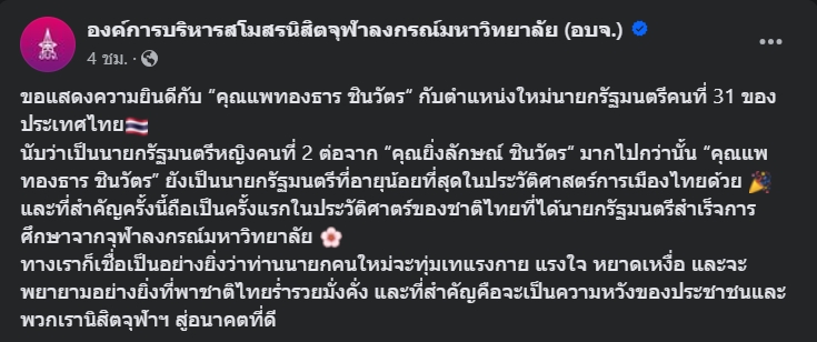 อบจ.นิสิตจุฬาฯ โพสต์ยินดี 'แพทองธาร' นายกฯคนแรก ศิษย์เก่าจุฬาฯ เชื่อ เป็นความหวังของปชช.