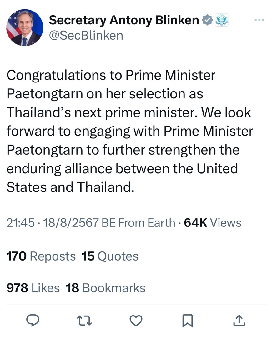 นายแอนโทนี บลิงเคน รัฐมนตรีว่าการกระทรวงการต่างประเทศสหรัฐ โพสต์ผ่านทวิตเตอร์ (X) ยินดีนายกฯคนใหม่ของไทย โดยระบุข้อความแปลเป็นไทยว่า ขอแสดงความยินดีกับคุณแพทองธาร ชินวัตร ซึ่งได้รับเลือกให้ดำรงตำแหน่งนายกรัฐมนตรีคนใหม่ของประเทศไทย สหรัฐฯ ตั้งตารอที่จะได้ทำงานกับนายกรัฐมนตรีแพทองธาร เพื่อเดินหน้าเสริมสร้างพันธไมตรีอันยั่งยืนระหว่างสหรัฐฯ กับไทย