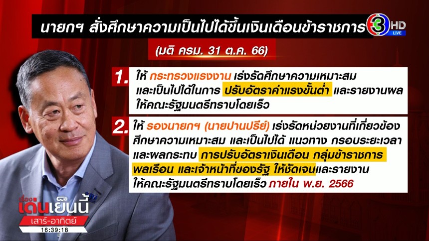 และที่เป็นไฮไลท์ คือ ข้อ 2.ให้รองนายกรัฐมนตรี (นายปานปรีย์ พหิทธานุกร) ในฐานะประธานกรรมการข้าราชการพลเรือน รับไปเร่งรัด ให้สำนักงานคณะกรรมการข้าราชการพลเรือน (ก.พ.) ร่วมกับกระทรวงการคลัง สำนักงบประมาณสำนักงานสภาพัฒนาการเศรษฐกิจและสังคมแห่งชาติ และหน่วยงานที่เกี่ยวข้อง ศึกษาความเหมาะสม และเป็นไปได้ แนวทาง กรอบระยะเวลา และผลกระทบของการปรับอัตราเงินดือนสำหรับกลุ่มข้าราชการพลเรือนและเจ้าหน้าที่ของรัฐให้ชัดเจน และรายงานผลให้คณะรัฐมนตรีทราบโดยเร็ว ภายในเดือนพฤศจิกายน 2566 ซึ่งคณะรัฐมนตรีพิจารณาแล้วลงมติเห็นชอบตามที่นายกรัฐมนตรีเสนอ