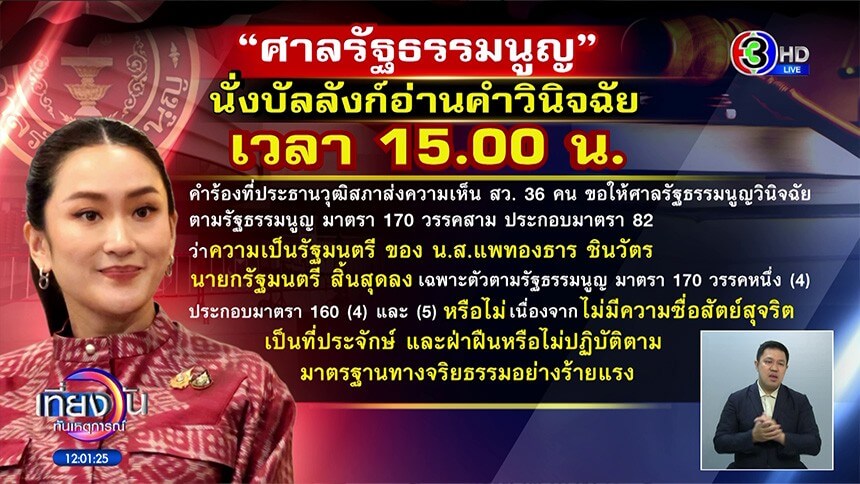 เมื่อเวลา 09.30 น.ศาลรัฐธรรมนูญ นัดแถลงด้วยวาจา ปรึกษาหารือ และลงมติในคดีที่ประธานวุฒิสภาส่งคำร้องของ สว. 36 คน ขอให้ศาลรัฐธรรมนูญวินิจฉัยว่า ความเป็นรัฐมนตรีของนางสาวแพทองธาร ชินวัตร นายกรัฐมนตรี สิ้นสุดลงเฉพาะตัวหรือไม่ ตามรัฐธรรมนูญ มาตรา 170 วรรคสาม ประกอบมาตรา 82 ว่า ความเป็นรัฐมนตรีของผู้ถูกร้องสิ้นสุดลงตามรัฐธรรมนูญ มาตรา 170 วรรคหนึ่ง (4) ประกอบมาตรา 160 (4) และ (5) จากกรณีคลิปเสียงสนทนากับสมเด็จ ฮุนเซน ประธานวุฒิสภากัมพูชา