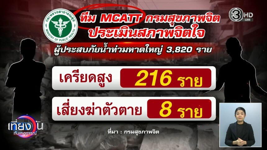 โดยเป็นตัวเลขจากกรมสุขภาพจิต ที่ได้ส่ง ทีมช่วยเหลือเยียวยาจิตใจ ผู้ประสบภัยในภาวะวิกฤติ ( MCATT) ลงพื้นที่ ประเมินสภาพจิตใจ ผู้ประสบภัยน้ำท่วมหาดใหญ่ ตั้งแต่วันศุกร์ที่ผ่านมา