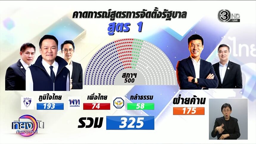 ส่วนอีกสูตร พรรคภูมิใจไทย พรรคกล้าธรรม และอีก 2 พรรคเล็ก สูตรนี้จะเกิดการต่อรองทางการเมืองมากเกินไป และจะผลักให้พรรคเพื่อไทยกับพรรคประชาชนเป็นฝ่ายค้านที่เข้มแข็ง รัฐบาลจะประสบปัญหามาก จึงเห็นว่า สูตร 3 พรรค คือ ภูมิใจไทย เพื่อไทยและกล้าธรรม เหมาะสม