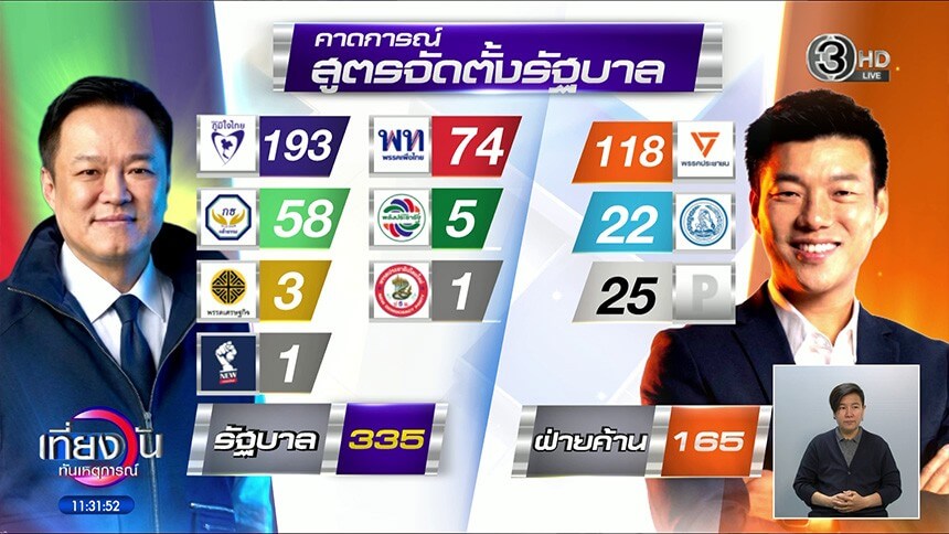 ส่วนการจับขั้วตั้งรัฐบาล ก็เริ่มเห็นความคืบหน้ามากขึ้น ตอนนี้มี 3 พรรคเล็ก ที่ประกาศเปิดตัวชัดเจนแล้ว ขณะที่สูตรรัฐบาลอนุทิน 2 ตามรายงานล่าสุด มีแนวโน้มว่าจะเป็นสูตรรัฐบาล 7 พรรค 335 เสียง
