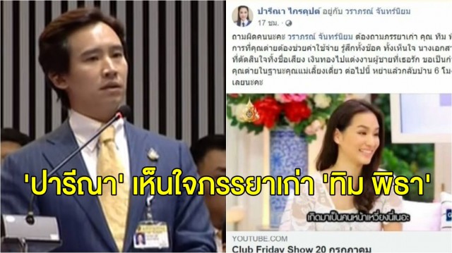 ล่าสุด น.ส.ปารีณา ไกรคุปต์ ส.ส.พรรคพลังประชารัฐ จ.ราชบุรี โพสต์ข้อความเกี่ยวกับ ต่าย ชุติมา ทีปะนาถ อดีตภรรยาของ ทิม พิธา และแชร์คลิปของรายการทีวีที่ ต่าย-ชุติมา ไปออกรายการ แล้วพูดถึงอดีตสามี