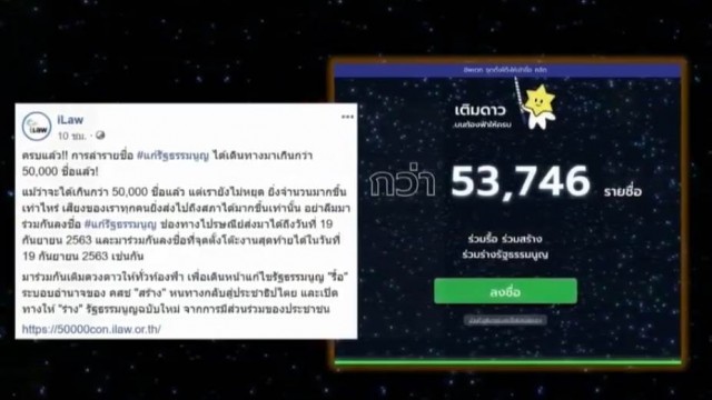 นอกจากนี้ iLaw หรือ โครงการอินเทอร์เน็ตเพื่อกฎหมายประชาชน ได้เปิดเผยความคืบหน้าการล่า 50,000 รายชื่อ ร่วมรื้อ ร่วมสร้าง ร่วมร่างรัฐธรรมนูญ ล่าสุดได้รายชื่อครบแล้ว