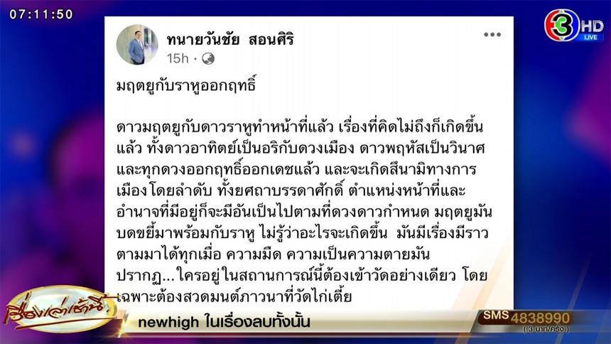 นายวันชัย ระบุว่า ดาวมฤตยูกับดาวราหูทำหน้าที่แล้ว เรื่องที่คิดไม่ถึงก็เกิดขึ้นแล้ว ทั้งดาวอาทิตย์เป็นอริกับดวงเมือง ดาวพฤหัสเป็นวินาศ และทุกดวงออกฤทธิ์ออกเดชแล้ว และจะเกิดสึนามิทางการเมืองโดยลำดับ ทั้งยศฐาบรรดาศักดิ์ ตำแหน่งหน้าที่และอำนาจที่มีอยู่ก็จะมีอันเป็นไปตามที่ดวงดาวกำหนด