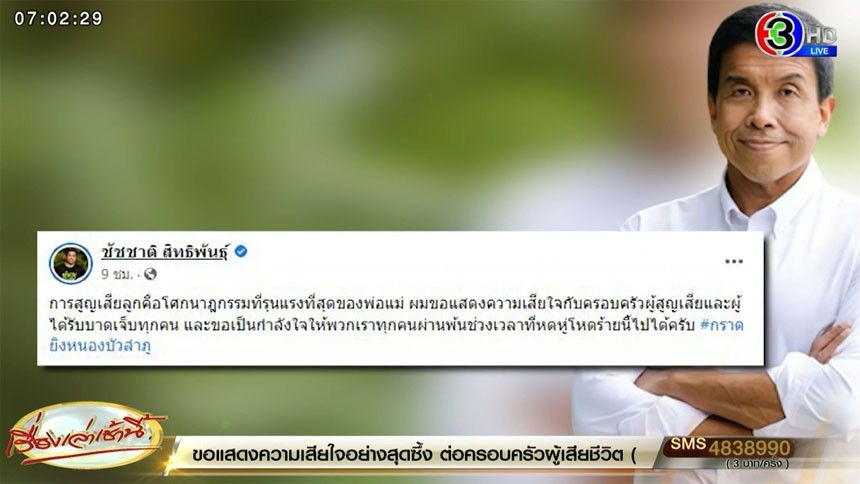 ทั้งนี้ นายชัชชาติ ยังได้โพสต์ข้อความผ่าน เฟซบุ๊ก ระบุ “การสูญเสียลูกคือโศกนาฎกรรมที่รุนแรงที่สุดของพ่อแม่ ผมขอแสดงความเสียใจกับครอบครัวผู้สูญเสียและผู้ได้รับบาดเจ็บทุกคน และขอเป็นกำลังใจให้พวกเราทุกคนผ่านพ้นช่วงเวลาที่หดหู่โหดร้ายนี้ไปได้ครับ #กราดยิงหนองบัวลําภู”