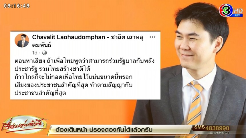 "ตอนหาเสียง ถ้าเพื่อไทยพูดว่าสามารถร่วมรัฐบาลกับพลังประชารัฐ รวมไทยสร้างชาติได้ ก้าวไกลก็จะไม่กอดเพื่อไทยไว้แน่นขนาดนี้หรอก เสียงของประชาชนสำคัญที่สุด ทำตามสัญญากับประชาชนสำคัญที่สุด"