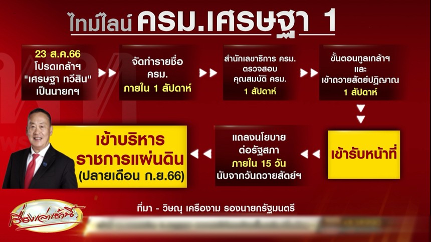 นายวิษณุ เครืองาม รองนายกรัฐมนตรี กล่าวถึงไทม์ไลน์การทำงานของครม.ชุดเก่าและชุดใหม่ ว่า เหตุที่ครม.ชุดเก่ายังต้องทำงานอยู่ แม้จะโปรดเกล้าฯนายกรัฐมนตรีคนใหม่แล้ว ก็ยังทำงานไม่ได้ เพราะยังไม่มีครม. ยังไม่ได้เข้าถวายสัตย์ ดังนั้นจึงคาดเดาจากประสบการณ์ ว่า การตั้งครม.จะได้รายชื่อภายใน 1 สัปดาห์ แล้วส่งให้สำนักเลขาธิการครม.ตรวจสอบคุณสมบัติ อีกประมาณ 1 สัปดาห์ จากนั้นเป็นขั้นตอนทูลเกล้าฯ และเข้าถวายสัตย์ปฏิญาณอีก 1 สัปดาห์ น่าจะใช้ระยะเวลารวมประมาณ 3 สัปดาห์นับจากนี้ไป ซึ่งไทม์ไลน์นี้เป็นการนับอย่างเร็ว และหากเป็นไปตามนี้ การประชุมครม.ชุดเก่ายังต้องมีอยู่ไปในทุกสัปดาห์ เพียงแต่วาระจะมีน้อย