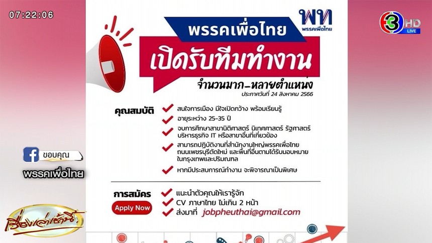 แท็กที่เกี่ยวข้อง พรรคเพื่อไทย ,ทีมงานพรรคเพื่อไทย ,พรรคเพื่อไทยประกาศรับสมัครงาน