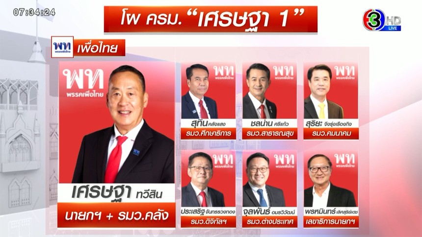 ซึ่งโผที่ออกมา ล่าสุดเมื่อวานนี้ 24 ส.ค. ชัดเจนสุดยังคงเดิมคือนายเศรษฐา ทวีสิน นายกรัฐมนตรี ควบ รัฐมนตรีว่าการกระทรวงการคลัง