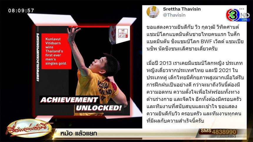 'นายกฯ เศรษฐา' ทวีตยินดี 'เจ้าวิว' คว้าแชมป์โลกแบดมินตัน ชายไทยคนแรกในประวัติศาสตร์