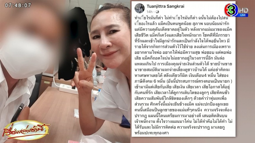 เมื่อวานนี้ (25 ตุลาคม) ผู้สื่อข่าวรายงานว่า เตือนจิตรา แสงไกร หรือ ตั้ม อดีตนายกเทศมนตรีเมืองอุทัยธานี และเป็นอดีตภรรยาของ นายชาดา ไทยเศรษฐ์ ได้โพสต์ผ่านเพจ “ตั้ม- เตือนจิตรา แสงไกร” ถึง นายวีระชาติ รัศมี หรือ แม็ค ลูกเขย ระบุว่า