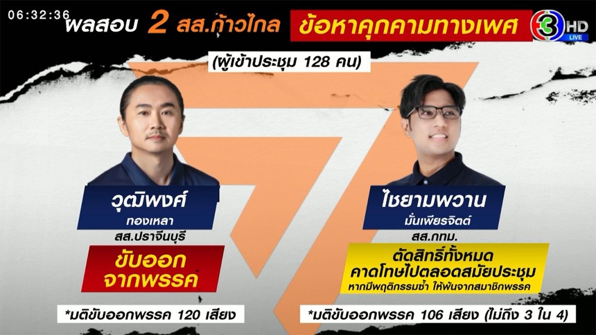 ก้าวไกล ประชุมร่วม 6 ชั่วโมง ได้ทางออก สส.คุกคามทางเพศ มีมติขับ ‘สส.ปราจีนบุรี’ พ้นพรรค ขณะที่ ‘สส.ปูอัด’ ยังรอด คาดโทษตัดสิทธิตลอดสมัยประชุม ต้องขอโทษ-เยียวยาผู้เสียหาย ฝ่าฝืน สส.พรรคประชุมถกอีกรอบขับออกได้ ‘ชัยธวัช’ รับ 2 เคสคุกคามทางเพศจริง ยันไม่ได้ตัดหางปล่อยวัด แต่ทำตามบทบาทพรรค ตอบกลับคนเห็นต่าง ล่าช้าแต่จำเป็นต้องฟังรอบด้าน เหตุกระบวนการซับซ้อน