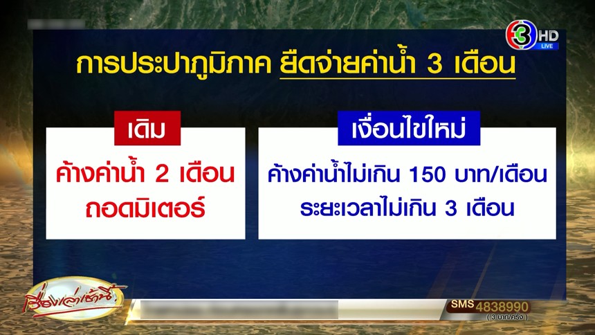 เงื่อนไขเดิม คือ ค้างค่าน้ำ 2 เดือน เราถอดมิเตอร์แล้ว แต่เงื่อนไขใหม่ที่เพิ่งหารือกันไปเมื่อวานนี้ ตามคำบัญชาท่านรัฐมนตรี เราให้ยืดเวลาชำระ สำหรับผู้ที่มีค่าน้ำคงค้างไม่เกิน 150 บาทต่อเดือน กำหนดเวลาไว้ไม่เกิน 3 เดือน รวมแล้วสามารถค้างค่าน้ำได้ 3 เดือน ไม่เกิน 450 บาท