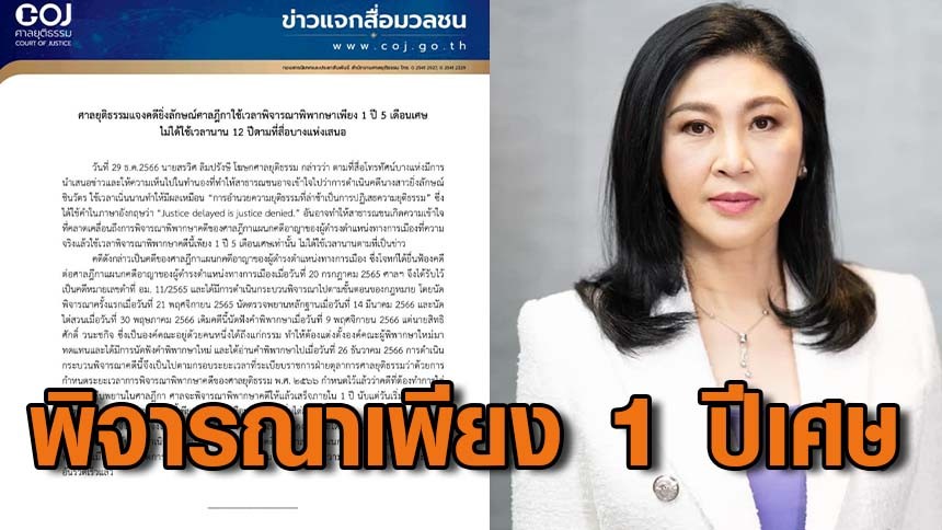 ศาลยุติธรรมแจงคดี "ยิ่งลักษณ์" ศาลฎีกาใช้เวลาพิจารณาพิพากษาเพียง 1 ปี 5 เดือนเศษ