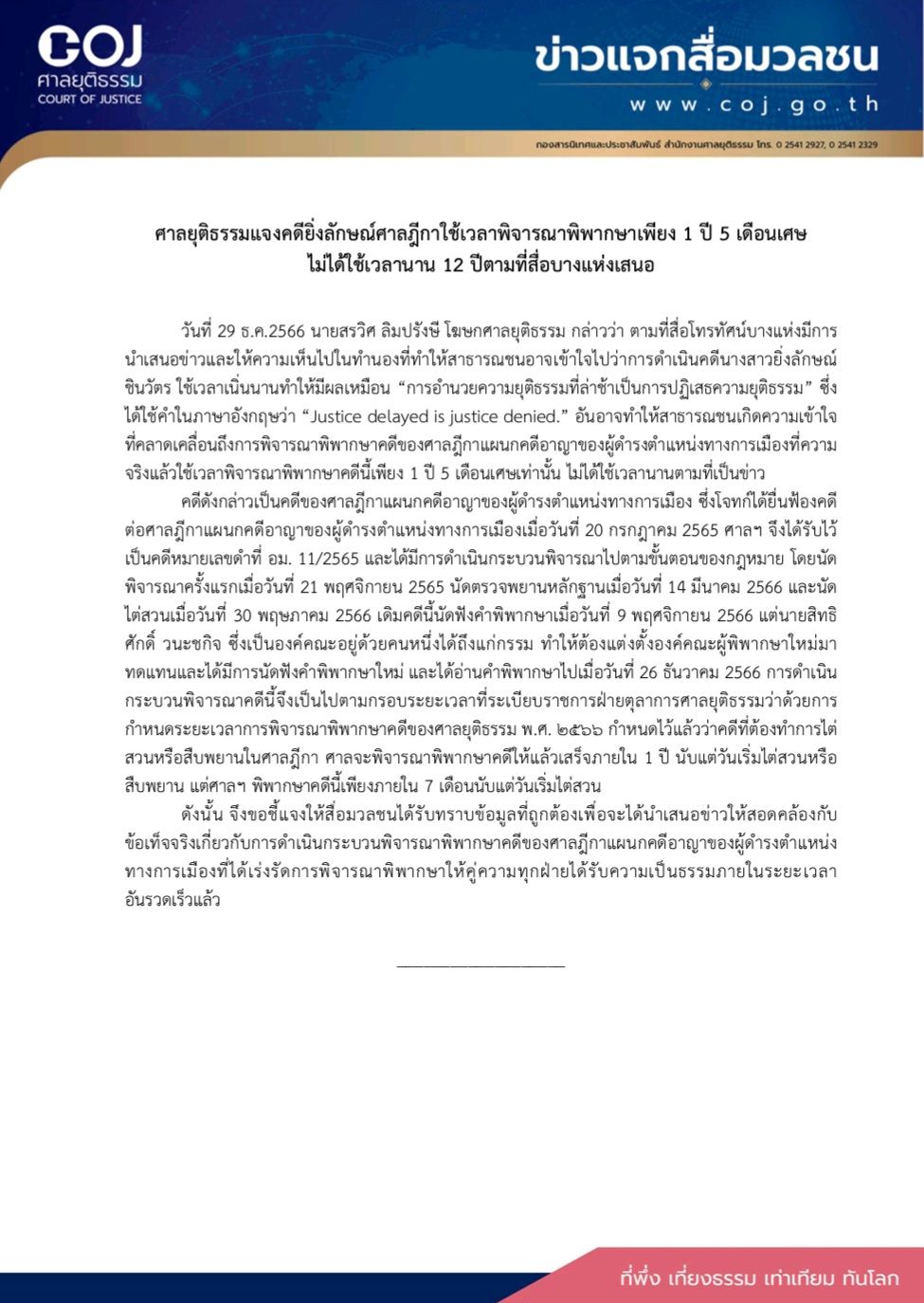 ดังนั้น จึงขอชี้แจงให้สื่อมวลชนได้รับทราบข้อมูลที่ถูกต้องเพื่อจะได้นำเสนอข่าวให้สอดคล้องกับข้อเท็จจริงเกี่ยวกับการดำเนินกระบวนพิจารณาพิพากษาคดีของศาลฎีกาแผนกคดีอาญาของผู้ดำรงตำแหน่งทางการเมืองที่ได้เร่งรัดการพิจารณาพิพากษาให้คู่ความทุกฝ่ายได้รับความเป็นธรรมภายในระยะเวลาอันรวดเร็วแล้ว