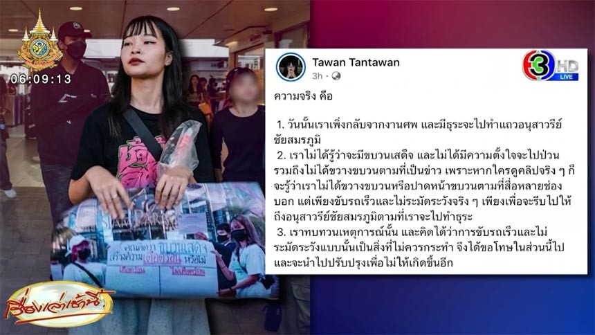 2. เราไม่ได้รู้ว่าจะมีขบวนเสด็จ และไม่ได้มีความตั้งใจจะไปป่วน รวมถึงไม่ได้ขวางขบวนตามที่เป็นข่าว เพราะหากใครดูคลิปจริง ๆ ก็จะรู้ว่าเราไม่ได้ขวางขบวนหรือปาดหน้าขบวนตามที่สื่อหลายช่องบอก แต่เพียงขับรถเร็ว และไม่ระมัดระวังจริง ๆ เพียงเพื่อจะรีบไปให้ถึงอนุสาวรีย์ชัยสมรภูมิตามที่เราจะไปทำธุระ