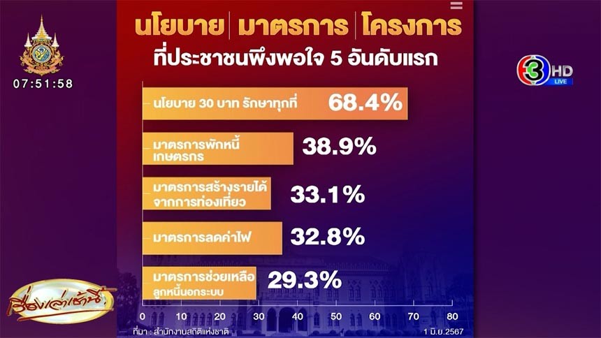 รัฐบาล-สำนักงานสถิติ ร่วมแถลงผลสำรวจความคิดเห็นประชาชน รอบ 6 เดือน พบประชาชนพอใจการบริหารงานของรัฐบาลมาก 44.3% ชอบนโยบาย 30 บาทรักษาทุกที่มากสุด