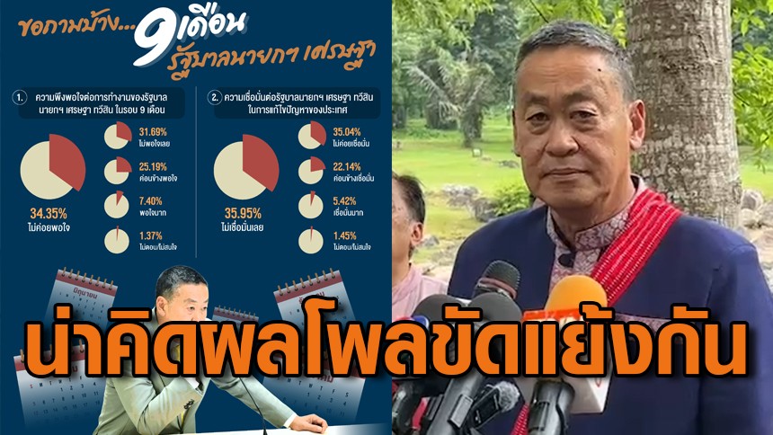 เมื่อเวลา 15.00 น. นายเศรษฐา ทวีสิน นายกรัฐมนตรีให้สัมภาษณ์ระหว่างลงพื้นที่จังหวัดลำปางถึงผลสำรวจของนิด้าโพลที่ระบุว่าประชาชนไม่พอใจการทำงานของรัฐบาลในช่วง 9 เดือนที่ผ่านมาว่า ตรงนี้ก็น่าคิดอยู่เหมือนกันเพราะทางสำนักงานสถิติแห่งชาติก็เพิ่งเผยผลสำรวจออกมาว่าตัวเลขออกมาใช้ได้ แต่อีกหนึ่งสัปดาห์ให้หลังนิด้าโพลก็มีผลสำรวจออกมาในลักษณะย้อนแย้ง