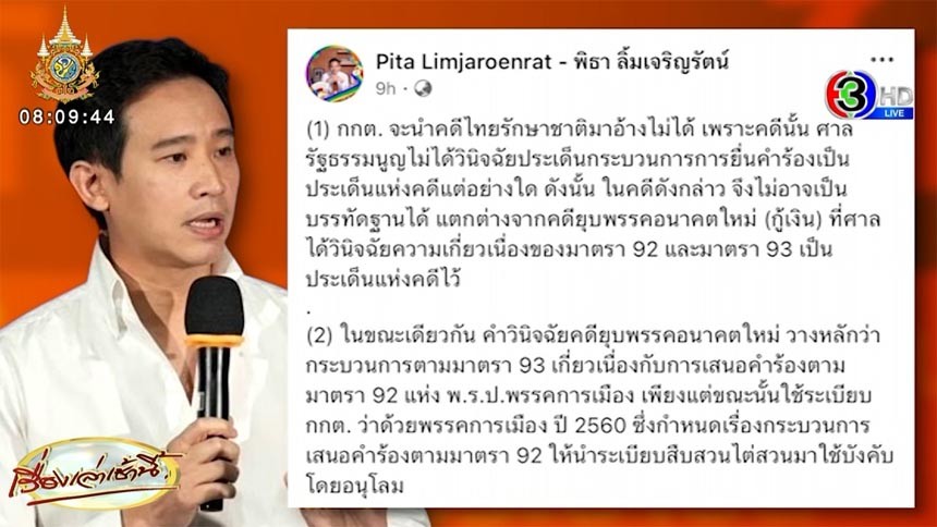 วานนี้ (13 มิ.ย.67) นายพิธา ลิ้มเจริญรัตน์ ส.ส.บัญชีรายชื่อ ที่ปรึกษาหัวหน้าพรรคก้าวไกล โพสต์ข้อความผ่านเฟซบุ๊ก กรณีที่นายปกรณ์ มหรรณพ กรรมการการเลือกตั้ง (กกต.) แถลงข่าวชี้แจงการยื่นคำร้องต่อศาลรัฐธรรมนูญเพื่อขอให้มีการสั่งยุบพรรคก้าวไกล โดยระบุว่า ผมขอกล่าวถึงกรณีที่คณะกรรมการการเลือกตั้ง แถลงข่าววันนี้ยืนยันว่าการยื่นให้ศาลรัฐธรรมนูญวินิจฉัยยุบพรรคก้าวไกล ได้ดำเนินการตาม พ.ร.ป.พรรคการเมือง มาตรา 92 จึงไม่มีเหตุต้องไต่สวน ซึ่งทำเช่นเดียวกับกรณีพรรคไทยรักษาชาติ ผมขอไล่เรียงเหตุผลเป็น 3 ข้อแบบนี้