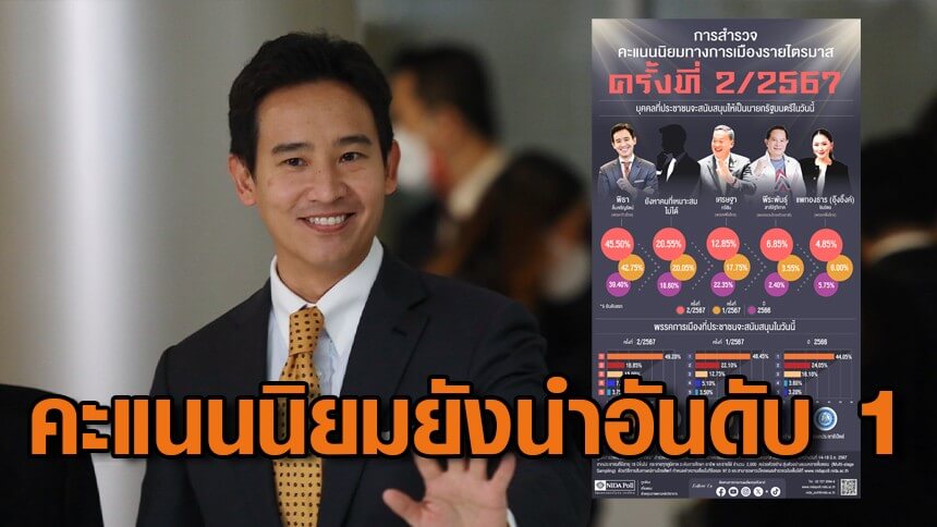 “นิด้าโพล” สำรวจคะแนนนิยมทางการเมืองไตรมาส 2/2567 ประชาชนยังหนุน “พิธา-ก้าวไกล” อันดับ 1