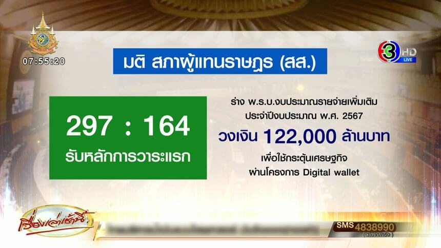 วานนี้ (17 ก.ค. 67) การประชุมสภาฯ วาระพิจารณาร่าง พ.ร.บ. งบประมาณรายจ่ายเพิ่มเติมประจำปีงบประมาณ พ.ศ.2567 พ.ศ.... วงเงิน 1.22 แสนล้านบาท ที่คณะรัฐมนตรี (ครม.) เป็นผู้เสนอ เพื่อใช้ใน 'โครงการเติมเงิน 1 หมื่นบาท ผ่านดิจิทัลวอลเล็ต' ได้ใช้เวลาอภิปรายกว่า 10 ชั่วโมง และหมดผู้อภิปรายแล้ว ที่ประชุมได้ลงมติว่าจะรับหลักการร่าง พ.ร.บ.ดังกล่าวหรือไม่ โดยมติเสียงข้างมาก 297 เสียง ลงมติรับหลักการ ขณะที่ 164 เสียง ไม่รับหลักการ