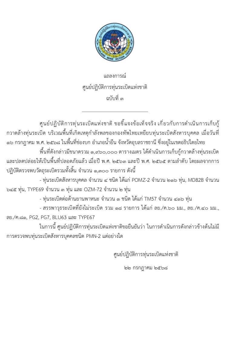 วันที่ 22 ก.ค.68 ศูนย์ปฏิบัติการทุ่นระเบิดแห่งชาติแถลงการณ์ ฉบับที่ 3 ขอชี้แจงข้อเท็จจริงเกี่ยวกับการดำเนินการเก็บกู้กวาดล้างทุ่นระเบิด บริเวณพื้นที่เกิดเหตุกำลังพลของกองทัพไทยเหยียบทุ่นระเบิดสังหารบุคคล เมื่อวันที่ 16 กรกฎาคม พ.ศ.2568 ในพื้นที่ช่องบก อำเภอน้ำยืน จังหวัดอุบลราชธานี ซึ่งอยู่ในเขตอธิบไตยไทย