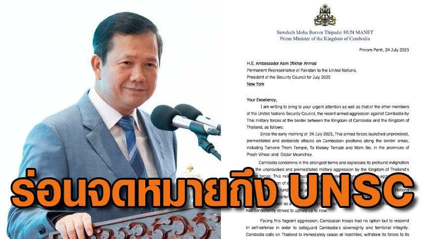 “ฮุน มาเนต” นายกรัฐมนตรีของกัมพูชา โพสต์ข้อความพร้อมเอกสารลงบนเฟซบุ๊กว่าเขาได้ส่งจดหมายถึง ฯพณฯ อาซิม อิฟติคาร์ อาห์มัด (Asim Iftikhar Ahmad) ผู้แทนถาวรปากีสถานประจำสหประชาชาติ ประธานคณะมนตรีความมั่นคงแห่งสหประชาชาติประจำเดือนกรกฎาคม พ.ศ. 2568 เพื่อขอให้คณะมนตรีความมั่นคงแห่งสหประชาชาติ (UNSC) จัดการประชุมฉุกเฉินเพื่อยุติการรุกรานของไทยต่ออธิปไตยกัมพูชา
