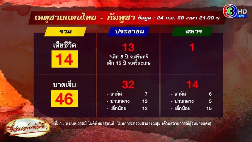 ปชช.อพยพหนีตาย เหตุสู้รบไทย-กัมพูชา ปชช.ตาย 13 บาดเจ็บ 32 ทหารดับ 1 เจ็บ 14 นาย