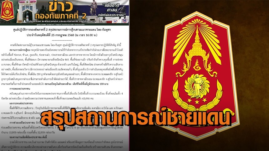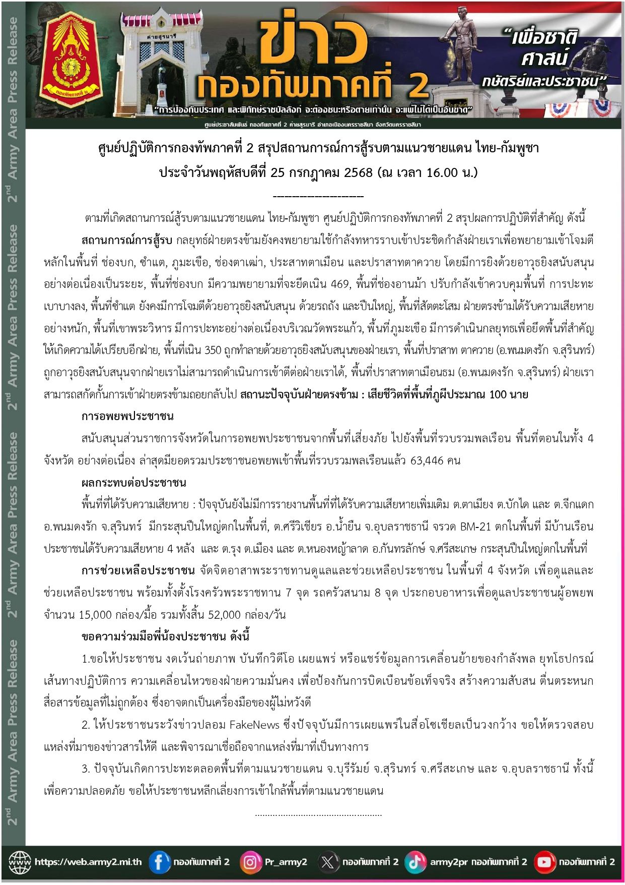 วันที่ 25 กรกฎาคม 2568 กองทัพภาคที่ 2 สรุปสถานการณ์การสู้รบตามแนวชายแดน ยอมรับกัมพูชาพยายามยึดเนิน 469 ที่ช่องบก-เขาพระวิหารปะทะต่อเนื่อง เผยเขมรดับในพื้นที่ภูผี 100 นาย เตือนประชาชนระวังข่าวปลอม