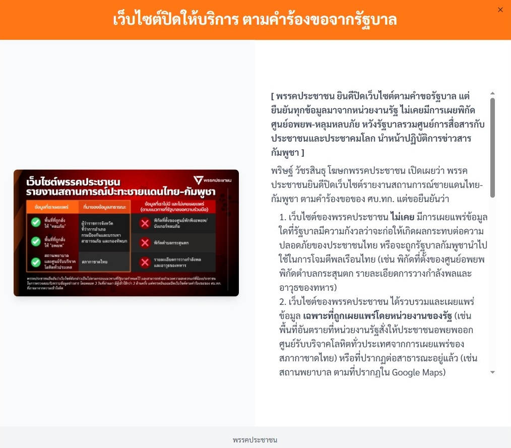 1. เว็บไซต์ของพรรคประชาชน ไม่เคยมีการเผยแพร่ข้อมูลใดที่รัฐบาลมีความกังวลว่าจะก่อให้เกิดผลกระทบต่อความปลอดภัยของประชาชนไทย หรือจะถูกรัฐบาลกัมพูชานำไปใช้ในการโจมตีพลเรือนไทย (เช่น พิกัดที่ตั้งของศูนย์อพยพ พิกัดตำบลกระสุนตก รายละเอียดการวางกำลังพลและอาวุธของทหาร)